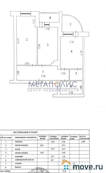 Общая площадь - 72 кв.м., жилая площадь - 34,1 кв.м., кухня - 14,5 кв.м.