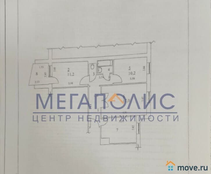 Общая площадь - 62,5кв.м, жилая площадь - 39кв.м, большая кухня - 11 кв.м.